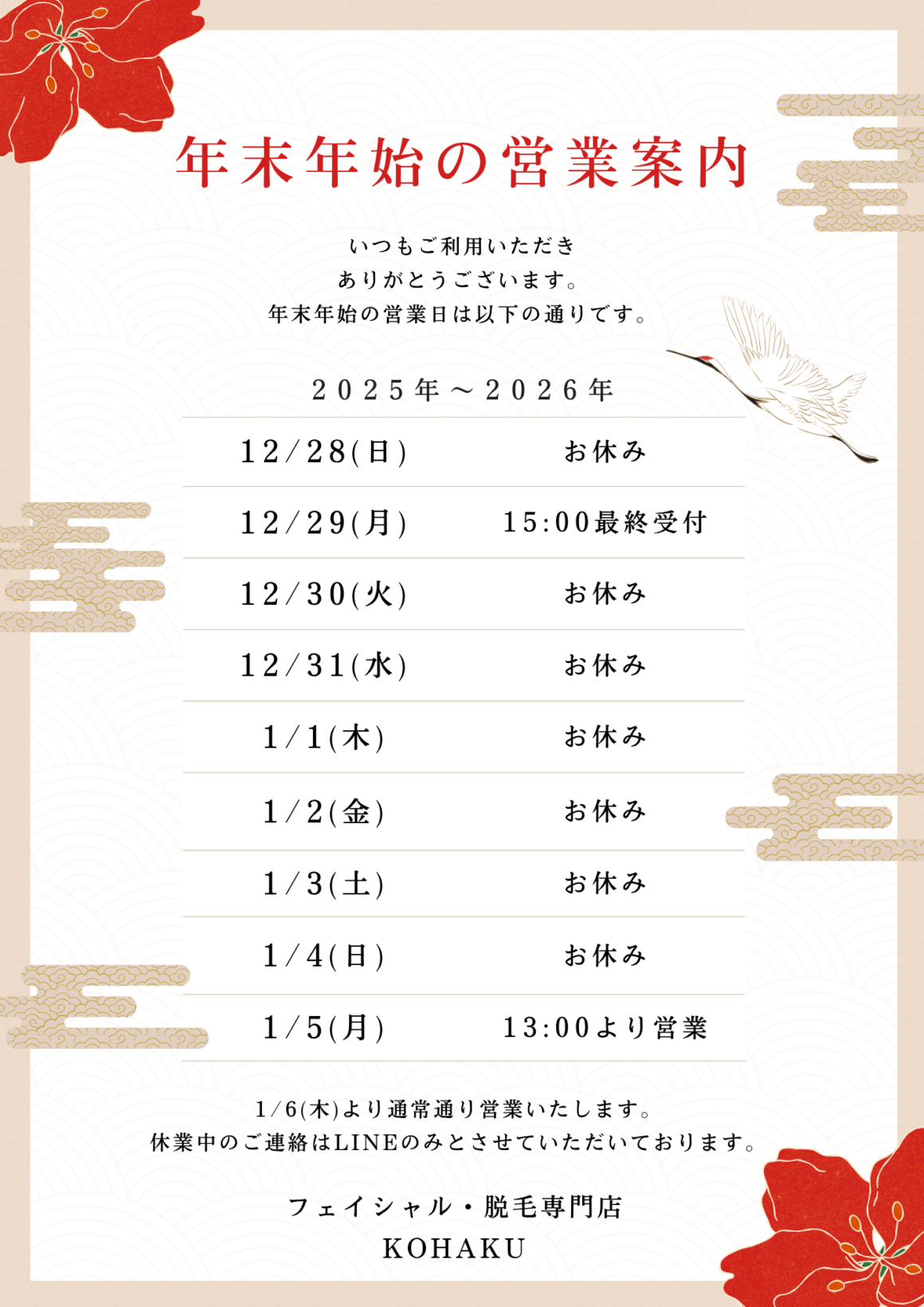 フェイシャル・脱毛専門店KOHAKU TOP > お知らせ > 年末年始の営業のご案内